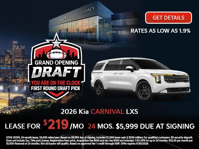 STK# 26159, 24-month lease, 10,000 miles/year. Based on $5,999 due at signing. Includes $1,000 lease cash & $500 military for qualified customers. $0 security deposit. Does not include Tax, Title and License. Registration Fees extra. Acquisition fee $650 and doc fee $490 not included. 1.9% APR for up to 24 months. $42.50 per month per $1,000 financed at 24 months. Not all buyers will qualify. Based on approved tier 1 credit through KMF. Offers expires 4/30/2026.