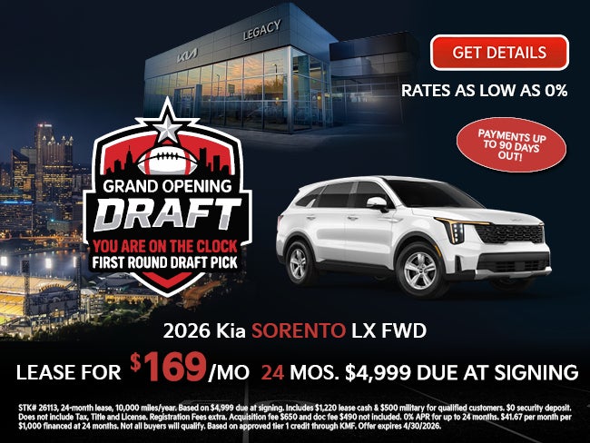 STK# 26113, 24-month lease, 10,000 miles/year. Based on $4,999 due at signing. Includes $1,220 lease cash & $500 military for qualified customers. $0 security deposit. Does not include Tax, Title and License. Registration Fees extra. Acquisition fee $650 and doc fee $490 not included. 0% APR for up to 24 months. $41.67 per month per $1,000 financed at 24 months. Not all buyers will qualify. Based on approved tier 1 credit through KMF. Offers expires 4/30/2026.