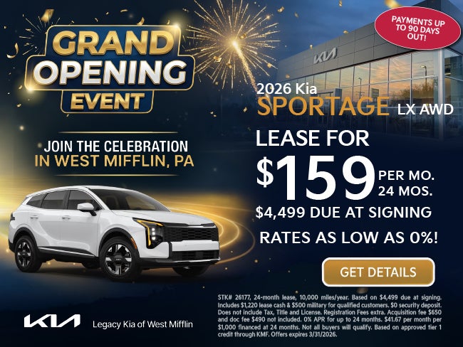 STK# 26177, 24-month lease, 10,000 miles/year. Based on $4,499 due at signing. Includes $1,220 lease cash & $500 military for qualified customers. $0 security deposit. Does not include Tax, Title and License. Registration Fees extra. Acquisition fee $650 and doc fee $490 not included. 0% APR for up to 24 months. $41.67 per month per $1,000 financed at 24 months. Not all buyers will qualify. Based on approved tier 1 credit through KMF. Offers expires 3/31/2026.